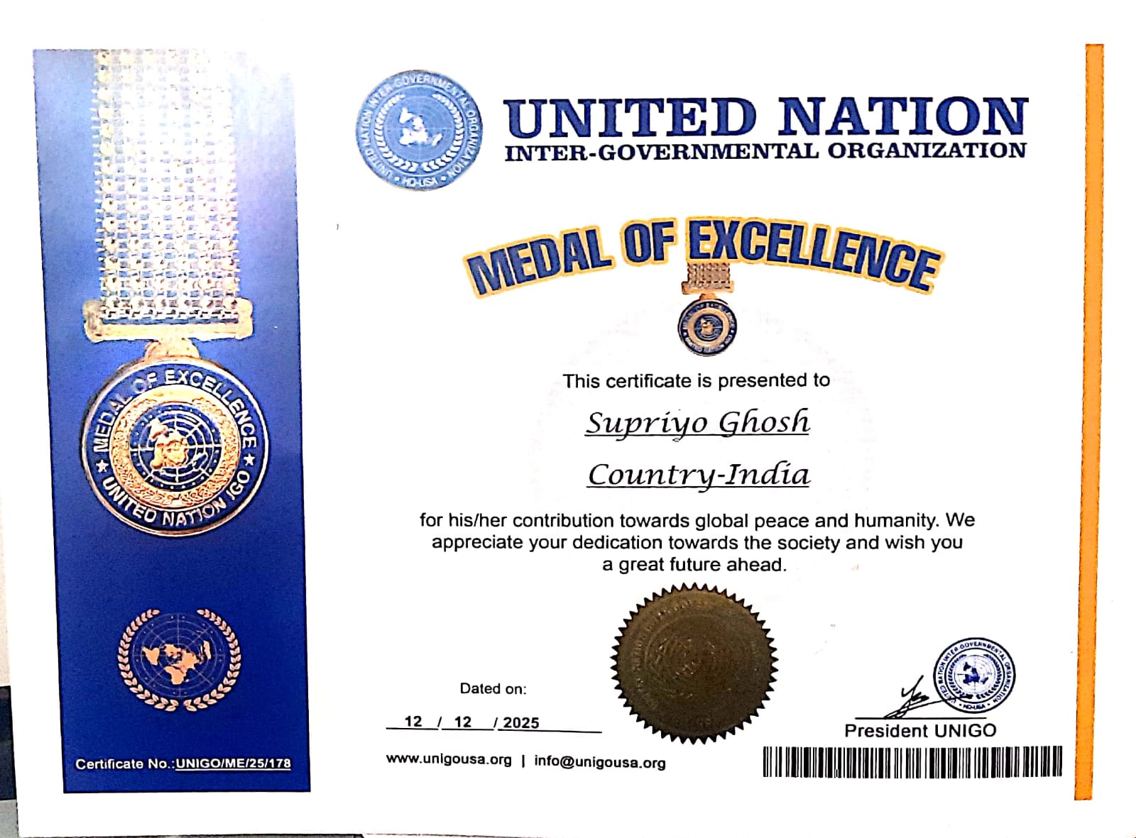 It is a tremendous honor to receive the Medal of Excellence from a United Nations intergovernmental organization. I am deeply humbled by this recognition and remain committed to the principles of service and global cooperation.