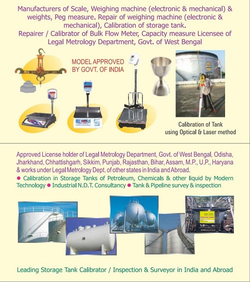 Manufacturers & Repairer of scale, weighing machine (electronic & mechanical) & weights. Repairer / calibrator of bulk flow meter, ultrasonic thickness ganging, capacity measure License Legal Metrology Department, Govt. of West Bengal.