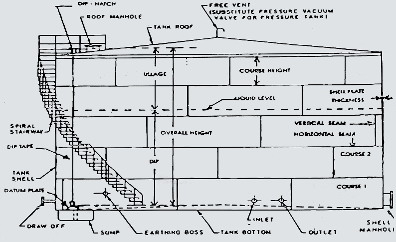 (1) Storage Tank (thereafter referred to as ‘tank’) – Specified modes of the inclination including a vat exceeding on kilolitre in capacity used for bulk storage of liquids or liquefied gases at atmospheric pressure or under low or high pressure with or without heading or cooling mounted aboveground or underground or on ships or barges together with its necessary supports, manholes, piping valves, gauges, meters etc, which shall be calibrated as a capacity measure.