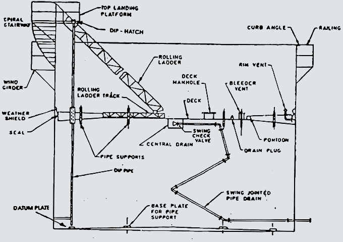 (6) DIP Pipe – A perforated metal pipe fitted below the dip hatch which projects downwards, ending near the bottom of the tank, directly above the dipping datum point and acts as a guide for the dip weight, particularly, when obstructions have to be avoided and it is obligatory in the case of a floating roof tank.